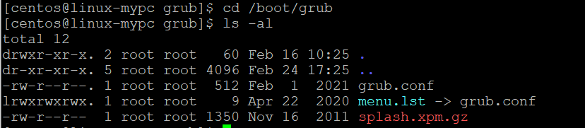 - GRUB(or GRUB2)은 커널 이미지(vmlinuz kernel image)를 로드하고 initrd(Ram Disk Init) 이미지를 실행시키며 시스템 제어권을 kernel에게 넘겨준다.