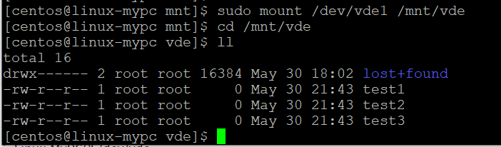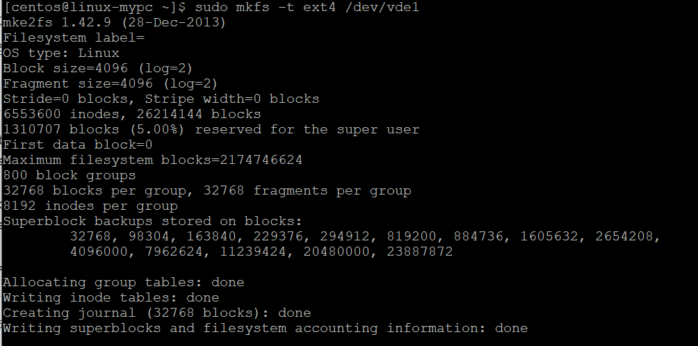 $ mkfs -t ext4 /dev/vde1