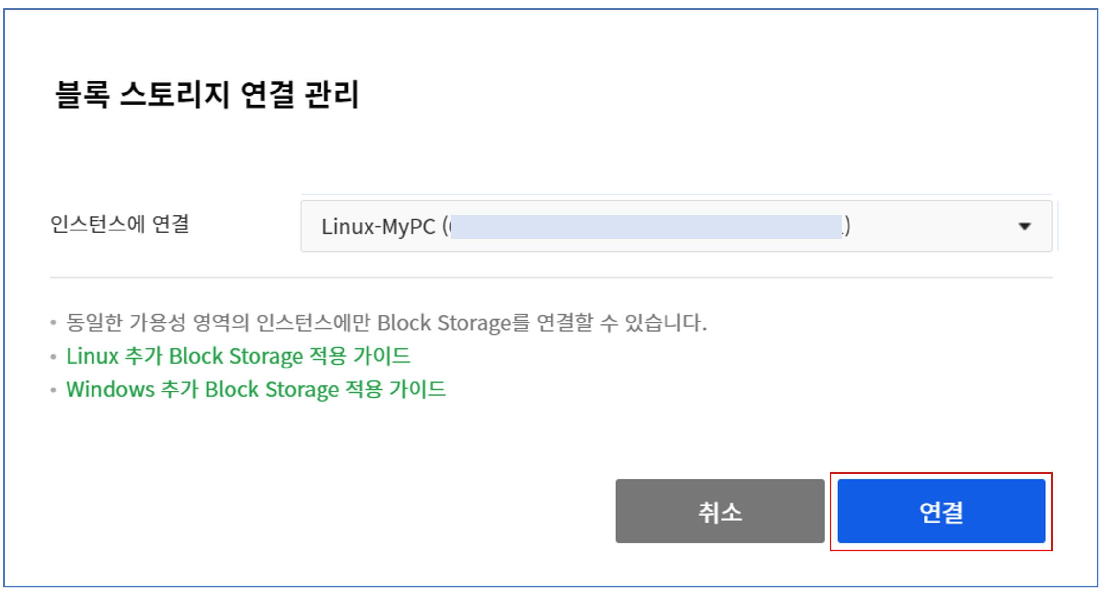 블록 스토리지는 인스턴스 실행 중에도 연결할 수 있습니다. 연결된 블록 스토리지는 빈 디스크이므로 사용하기 전에 인스턴스의 운영체제에 따라 파티션 작업, 포맷, 마운트 작업을 직접 진행해야 한다.