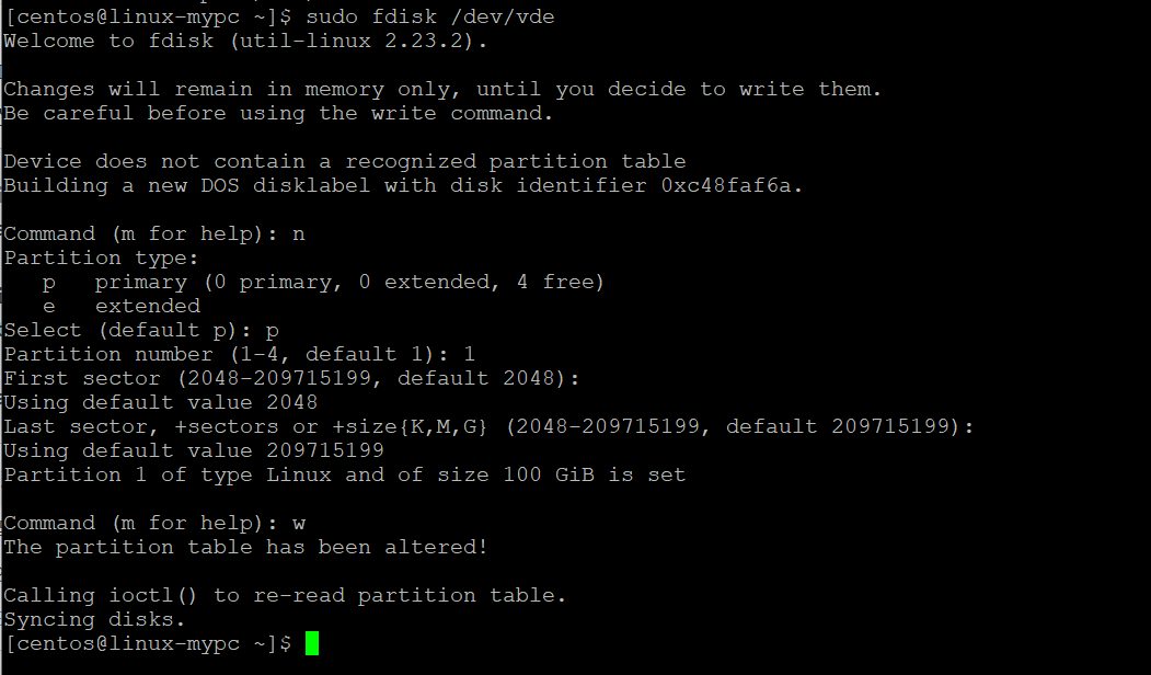 다음와 같이 fdisk 유틸리티를 이용하여 디스크 전체를 파티션 하나로 만듭니다. 필요에 따라 디스크 하나를 여러 파티션으로 나눌 수도 있습니다.