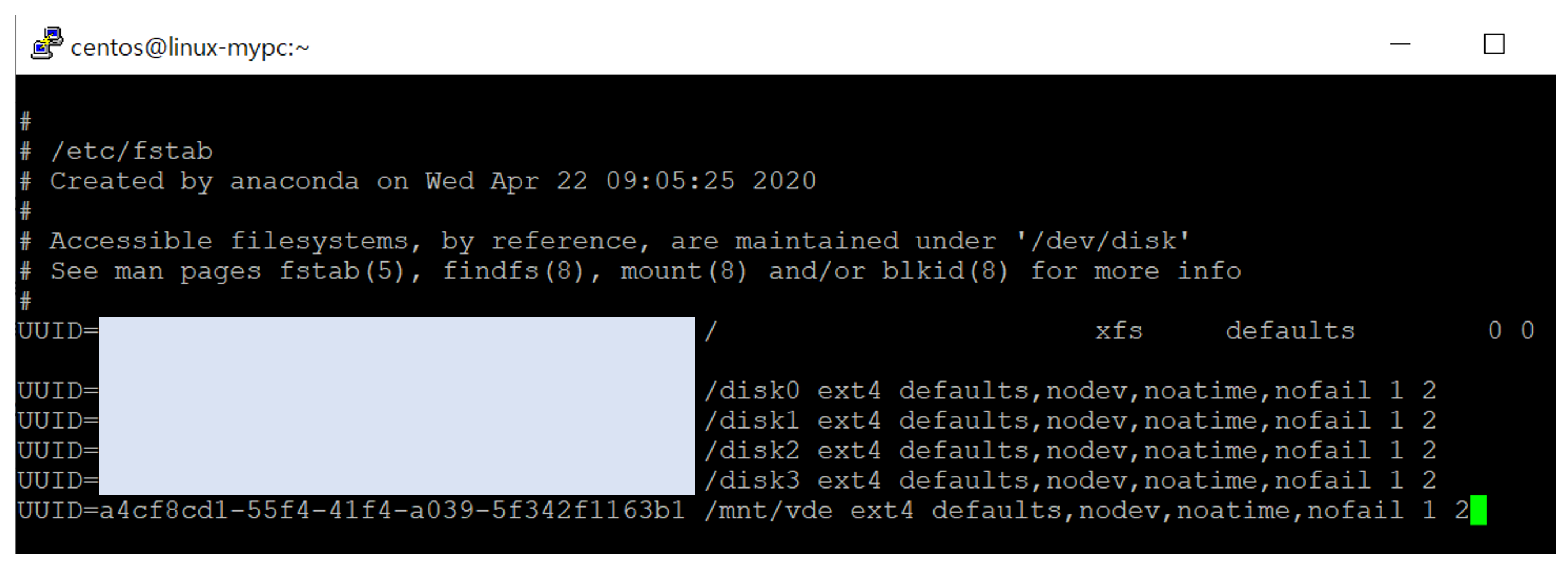 $ echo "UUID=a4cf8cd1-55f4-41f4-a039-5f342f1163b1 /mnt/vde ext4 defaults,nodev,noatime,nofail 1 2">>/etc/fstab