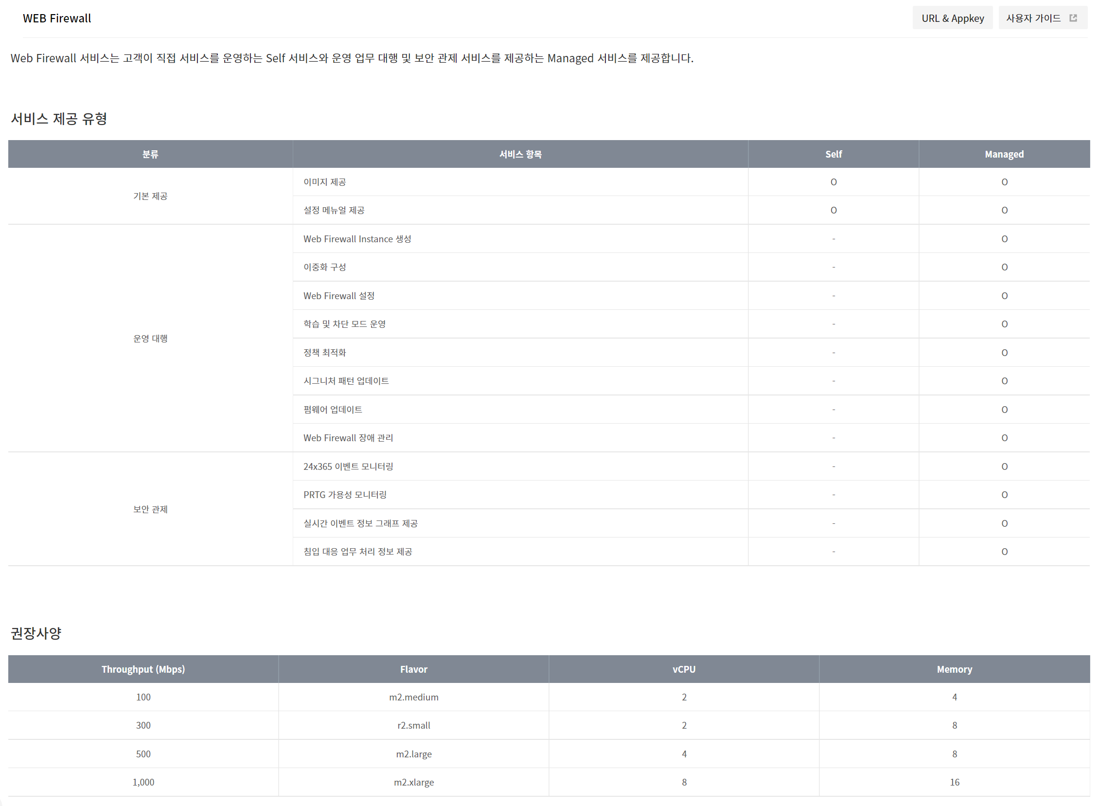 - Managed 서비스를 선택하면 전문 엔지니어가 웹 방화벽 운영 및 보안관제 서비스를 제공합니다.