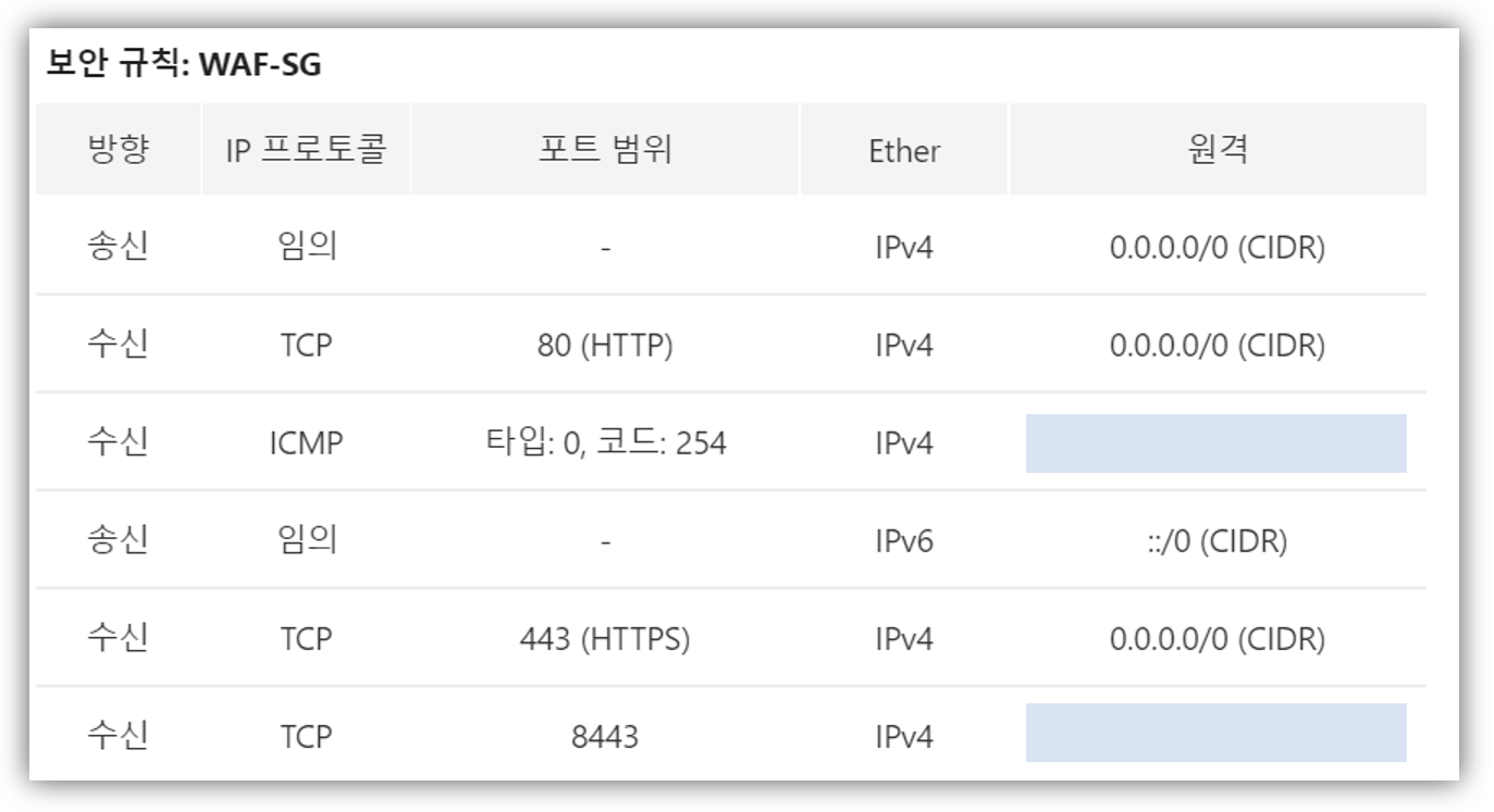 - TCP | 8443 | 내 IP // 웹 방화벽 관리용 포트(관리자)