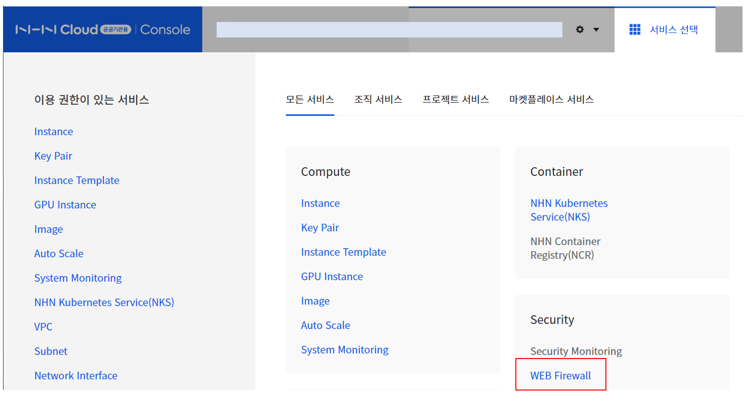 1. NHN Cloud 콘솔에서 Web Firewall Service 활성화