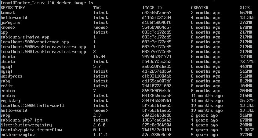 $ docker images 혹은 $ docker image ls 를 입력한다.