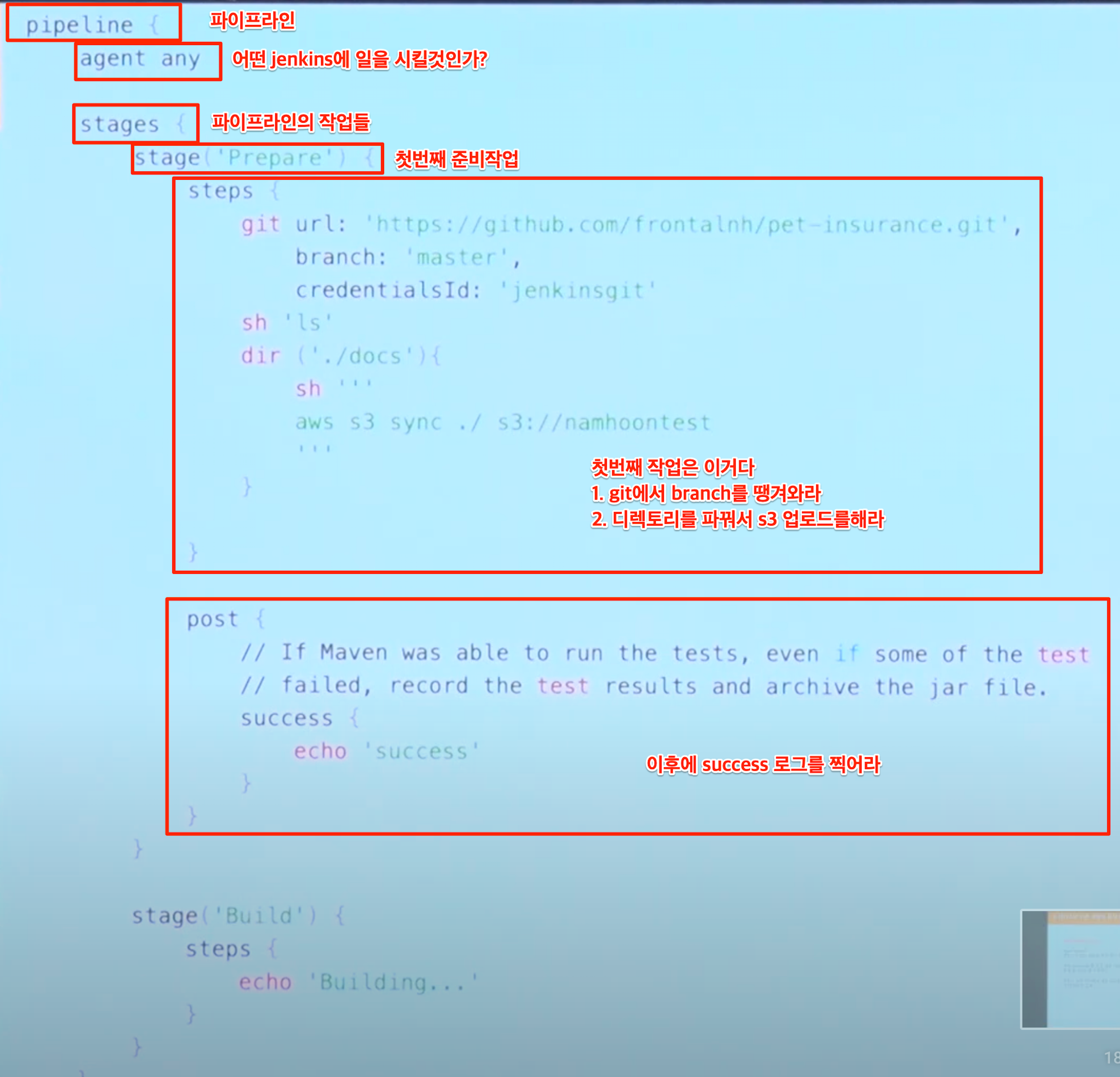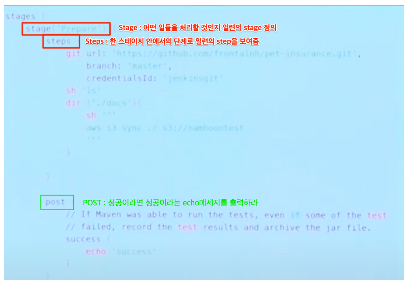 - 위에서는 git에서 branch를 받아와서 디렉터리를 바꾸고 s3파일 업로드를 한 뒤 로그를 찍는 젠킨스 파이프라인의 예제이다.