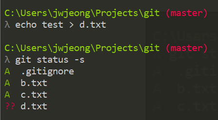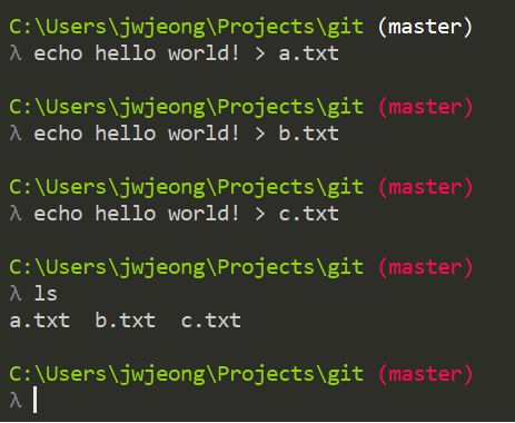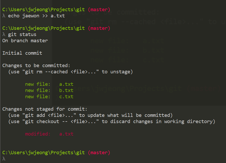 $ git jaewon >> a.txt // a.txt 파일에 내용 추가.