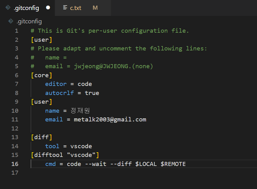 git config --global -e // 글로벌로 설정된 것을 edit 모드로 열기