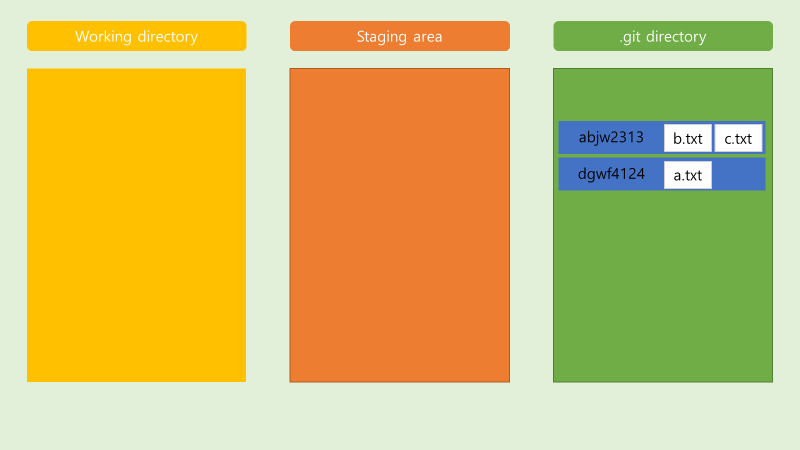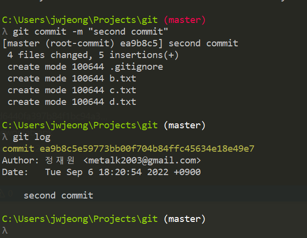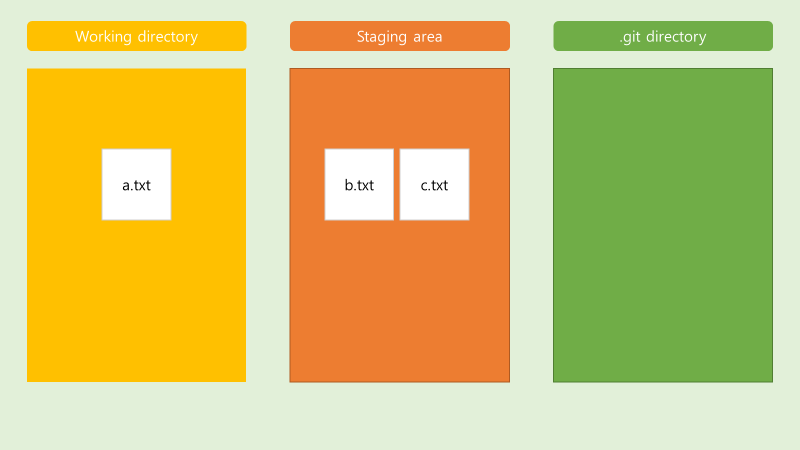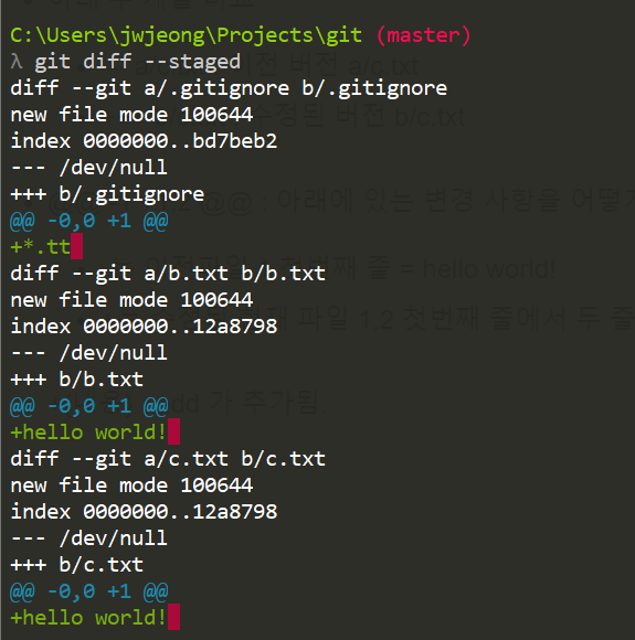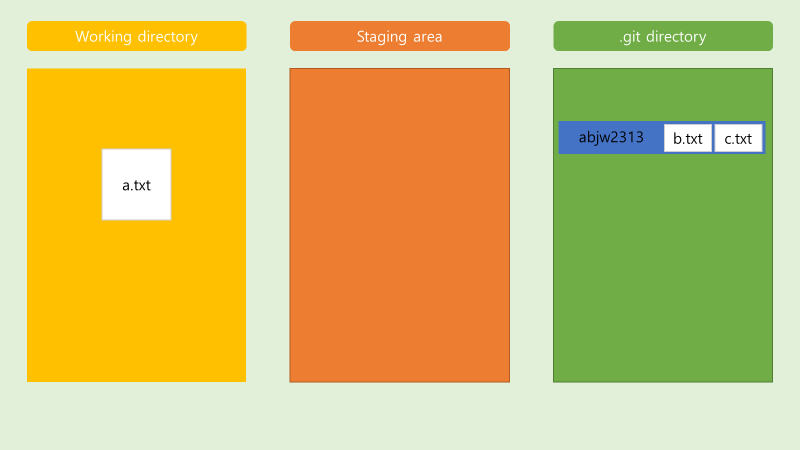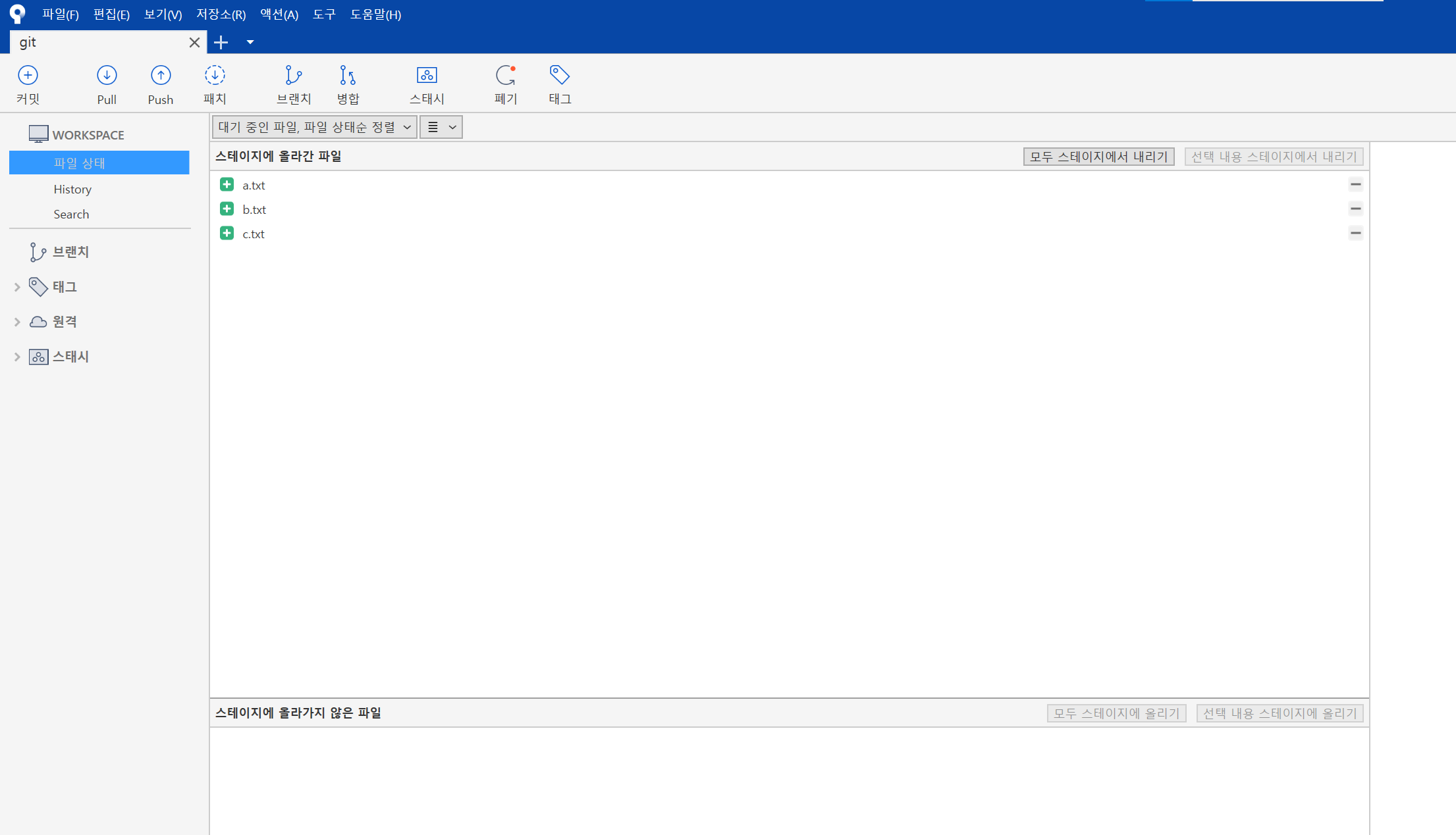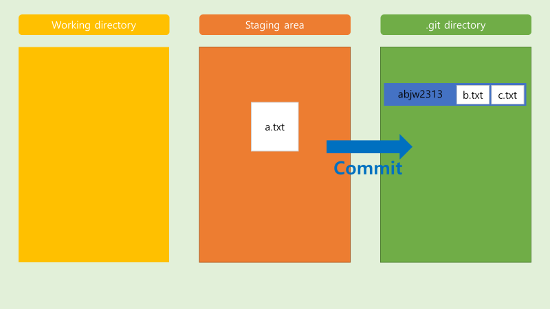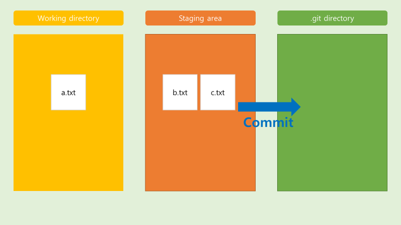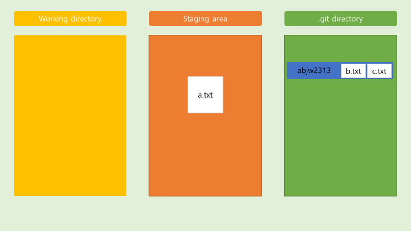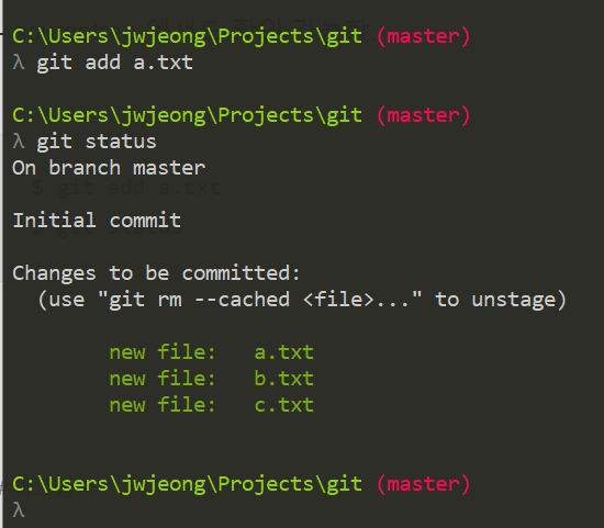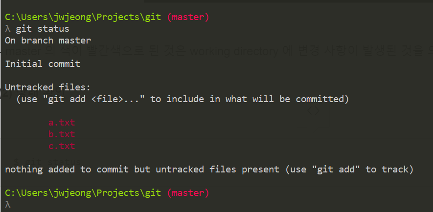 - a.txt b.txt c.txt 파일이 commit 할 준비가 되어 있음.