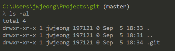 ls -al 명령어로 확인해보면 .git 이라는 파일이 생성되어 있음.