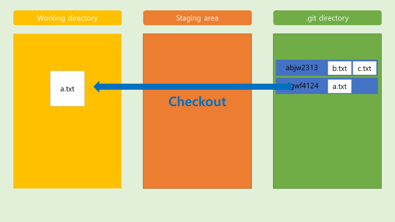 - commit 된 파일에서 checkout 을 통해 가져와서 변화된 a.txt 를 없애버릴 수 있음.