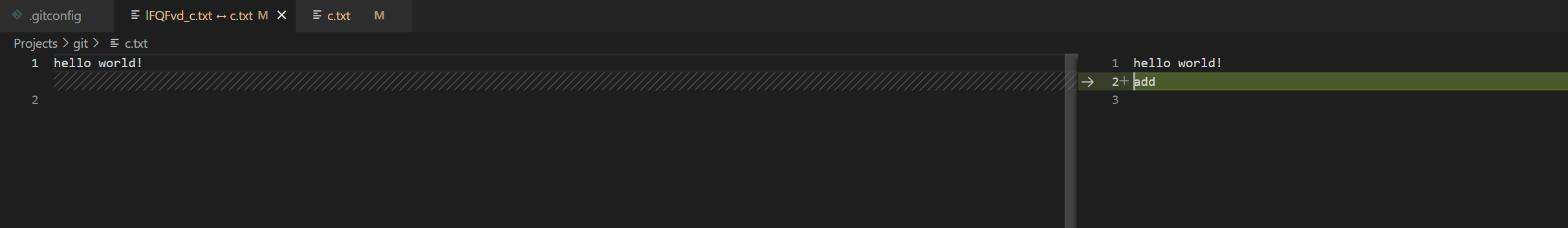 - +는 수정된 현재 파일 1,2 첫번째 줄에서 두 줄까지 : hello world! 하고 다음 줄
