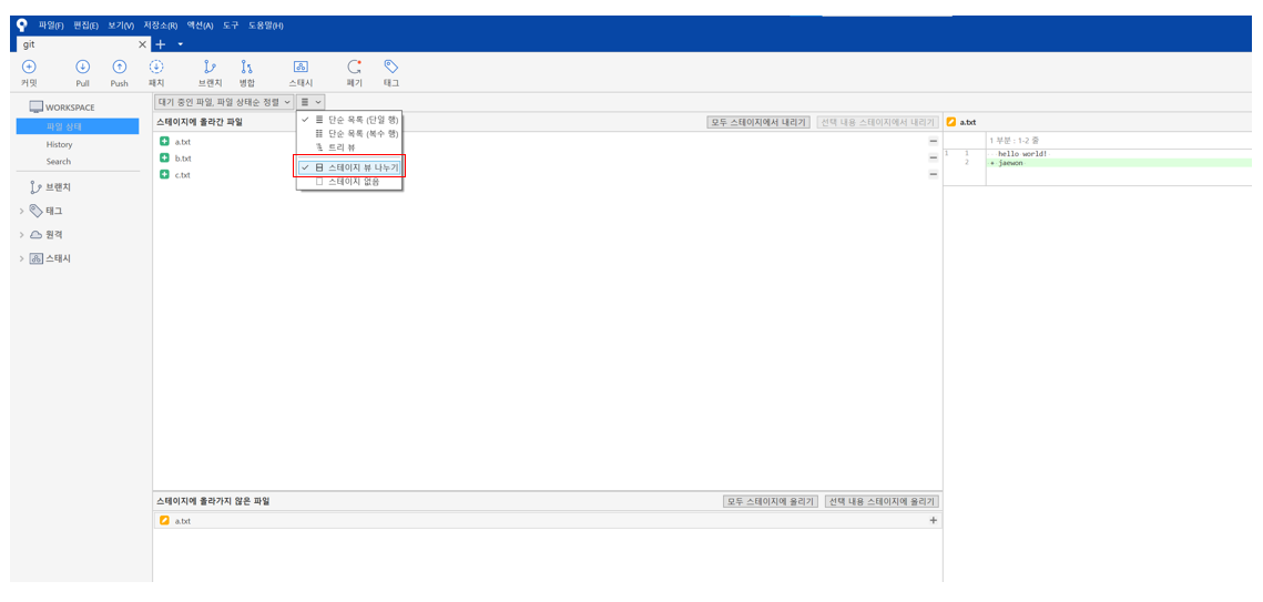- a.txt 파일에 수정이 있었음. ( git add 를 통해 업데이트 가 필요함.)