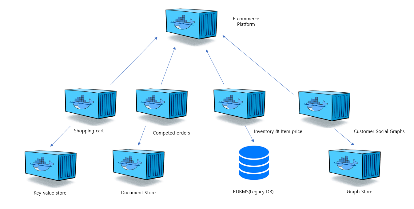 - 개발한 프로그램과 실행환경을 모두 컨테이너로 만들어, MSA(Micro Service Architecture) 환경이 Polyglot 애플리케이션 운영. 예를 들어, shopping cart는 java, competed order는 php로 Inventory&Item price는 node.js로 Application을 개발하는 데 가장 적합한 언어를 선택하여 하나의 플랫폼(E-commerce Platform)을 구현할 수 있다.