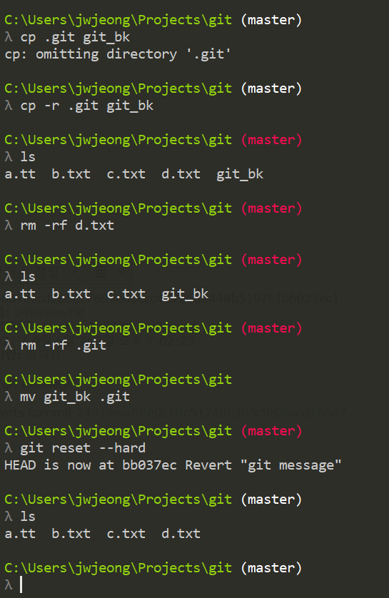 - 기존 .git 파일 삭제 후, 백업본으로 교체