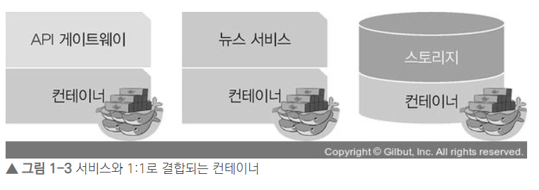 컨테이너 인프라 환경에서는 컨테이너를 서비스 단위로 포장해 손쉽게 배포하고 확장할 수 있다. 컨테이너 인프라 환경에서 제공하는 컨테이너는 마이크로서비스 아키텍처의 서비스와 1:1로 완벽하게 대응한다.