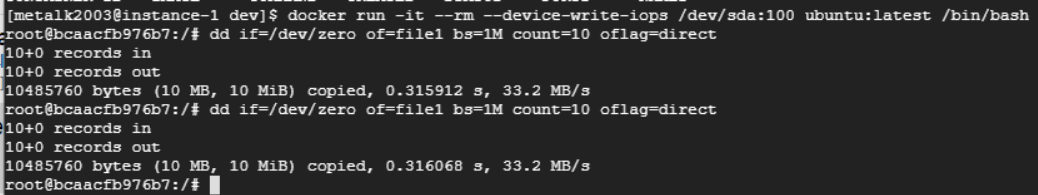$ docker run -it --rm --deivce-write-iops /dev/sda:100 ubuntu:latest /bin/bash
