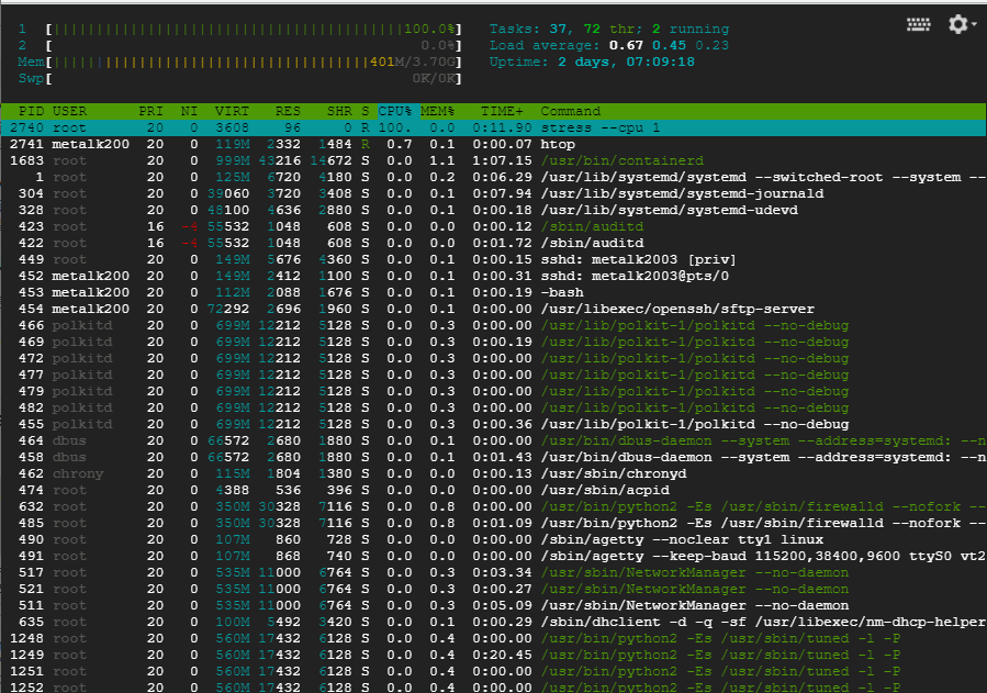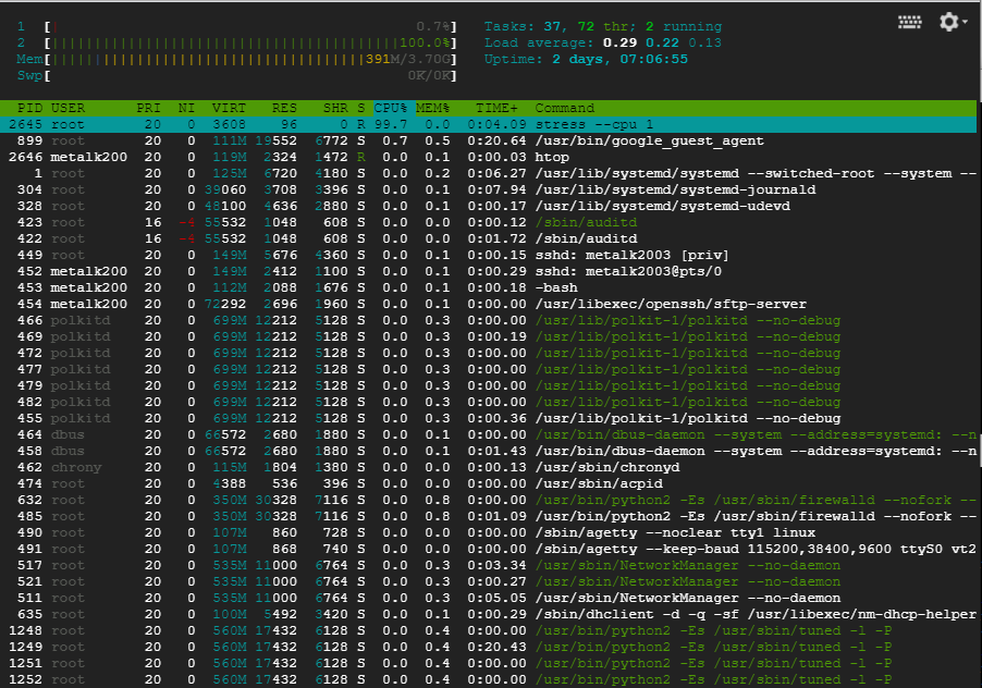 CPU 부하 테스트 : 2개 cpu core를 100% 사용하도록 부하 발생 : stress --cpu 2