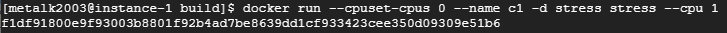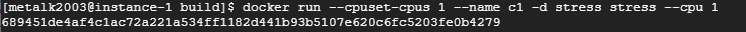 $ docker run --cpuset-cpus 1 --name c1 -d stress stress --cpu 1