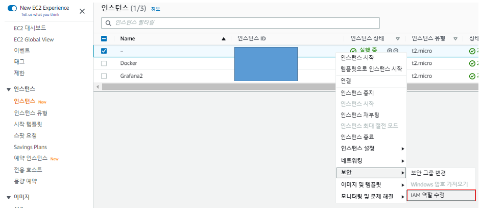 - 적용할 인스턴스 우클릭 > [보안] > [IAM 역할 수정]