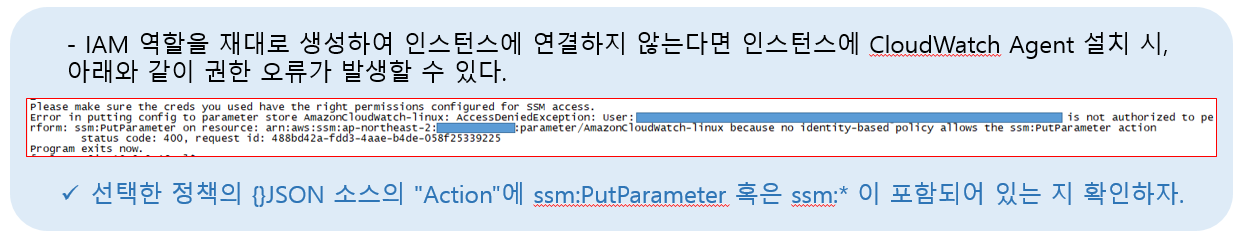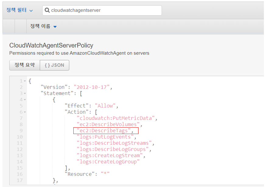 권한 오류였고, {}JSON 파일을 편집해도 되지만, IAM 역할에 CloudWatchAgentServerPolicy 정책에 "ec2:DescribeTags" Action이 있는 것을 확인 후 추가.