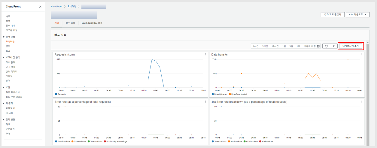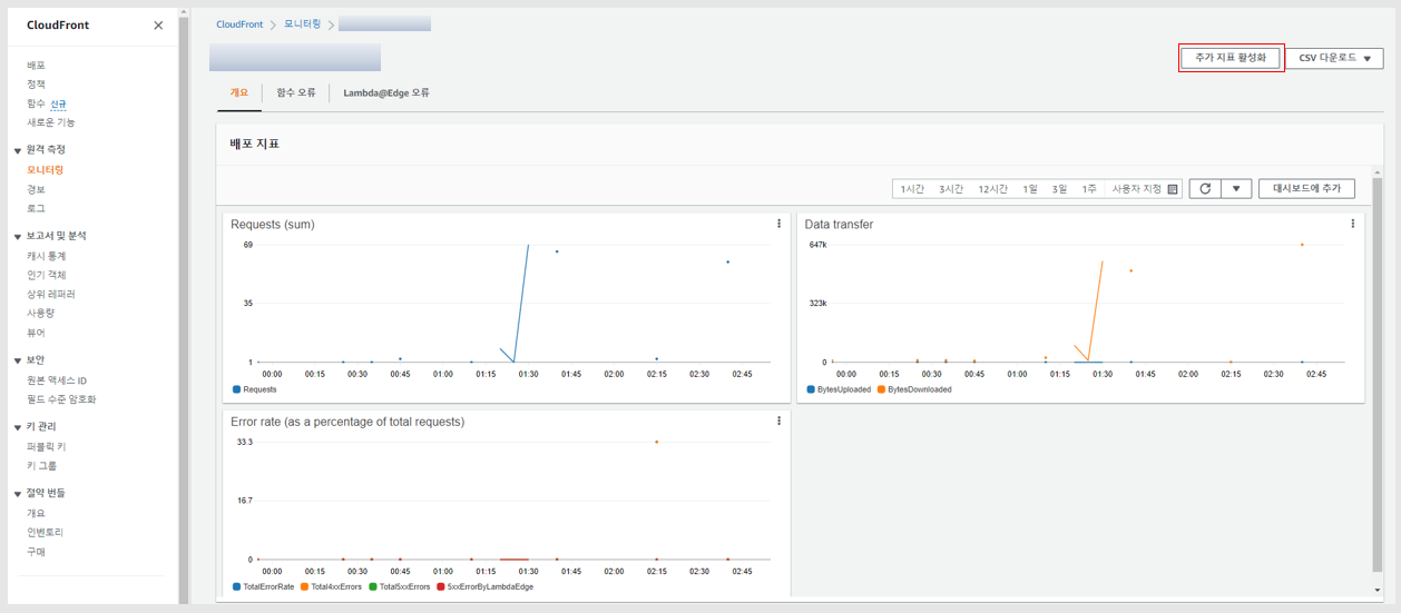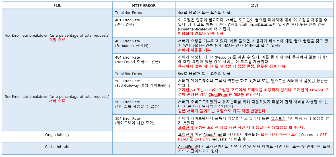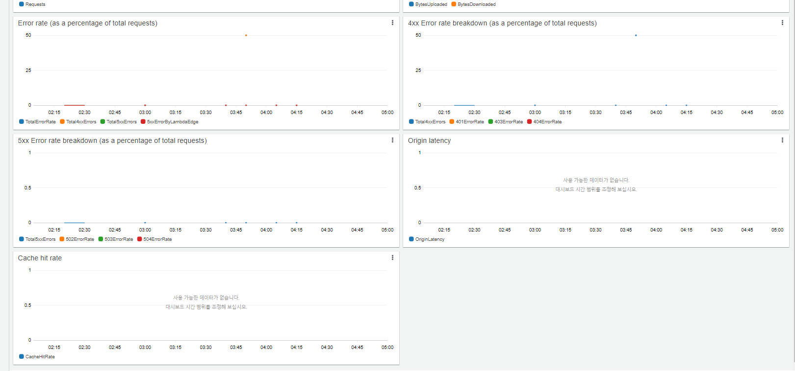 5xx Error rate 는 CloudFront 배포의 상태를 이해하는 데 중요한 지표이다. 이는 서버 오류 응답이라고도 하는 5xx로 응답한 모든 요청의 비율이다.