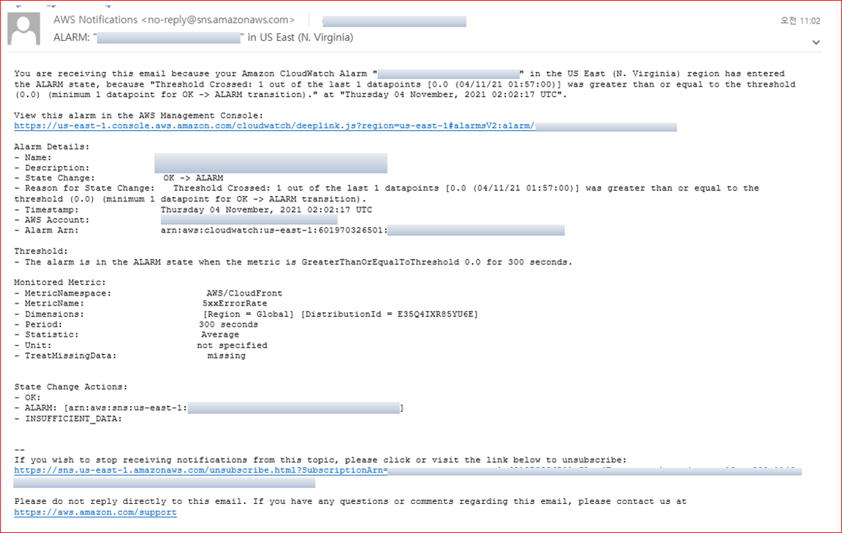 5. CloudWatch 경보가 임계값을 벗어난 지표를 감지하는 경우 알림을 받음.