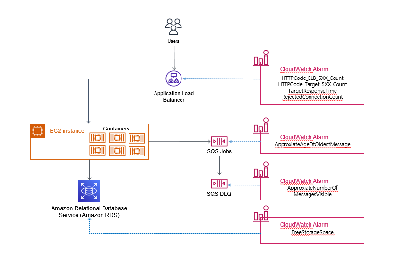(참고) 애플리케이션이 실행 중인 EC2 인스턴스를 모니터링할 필요가 없다. 모든 장애 조건으로 인해 이미 로드 밸런서에서 모니터링 중인 5xx 오류 또는 긴 대기 시간이 발생한다.