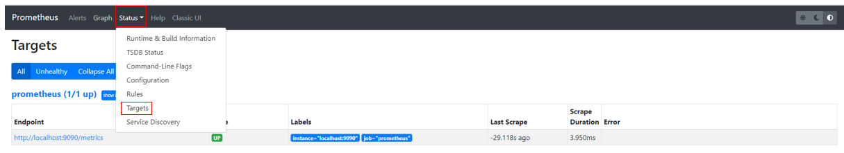 - [Status] > [Targets] : 어떤 Exporter를 수집하고 있는 지 대상(Targets)을 확인할 수 있다.