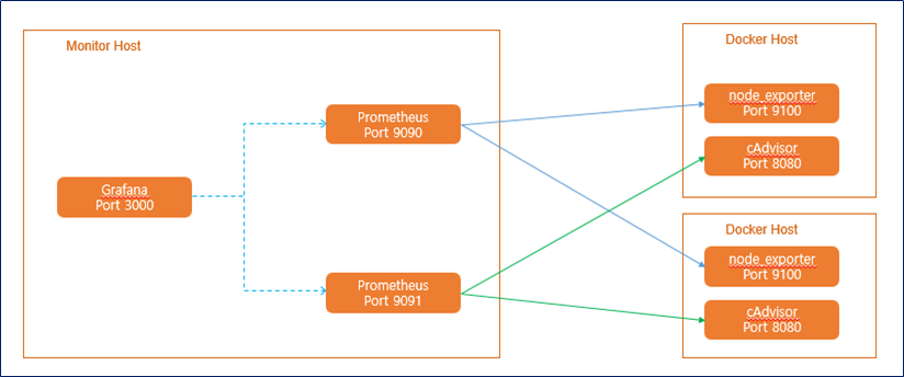 - node_exporter의 metric 수집용 prometheus와 cAdvisor의 metric 수집용 prometheus 두 개를 띄운다.
