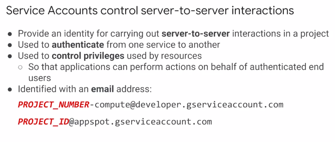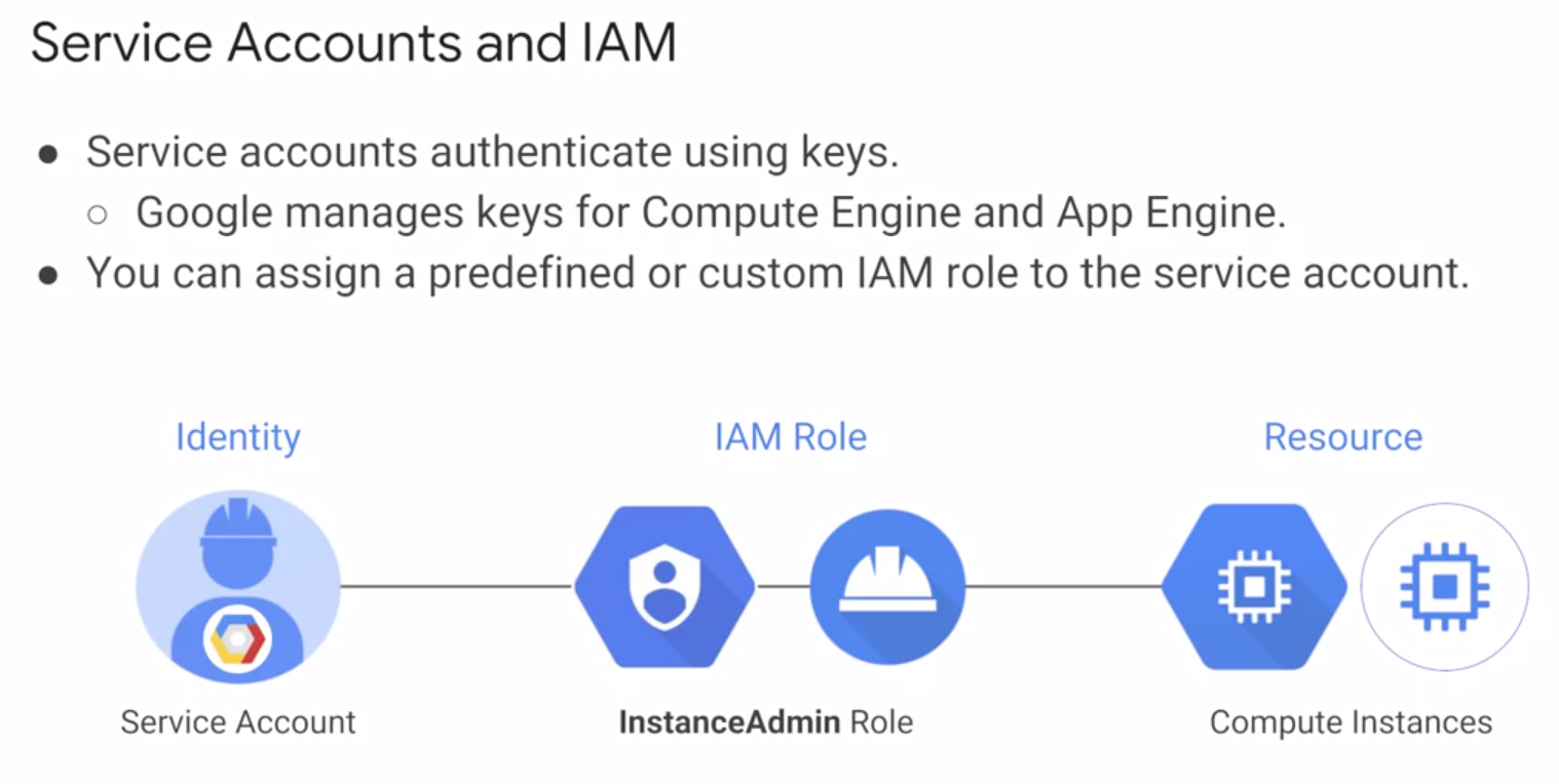 - 서비스 계정은 이메일 주소로 이름이 지정된다. 하지만 비밀번호 대신 리소스에 액세스하기 위한 암호화 키를 사용한다. 이 간단한 예에서 서비스 계정에 Compute Engine의 InstanceAdmin 역할이 부여되었다. 이렇게 하면 해당 서비스 계정으로 VM에서 실행되는 애플리케이션을 만들 수 있다.
