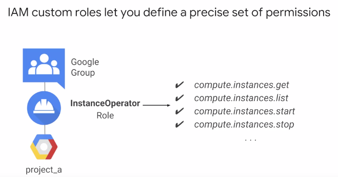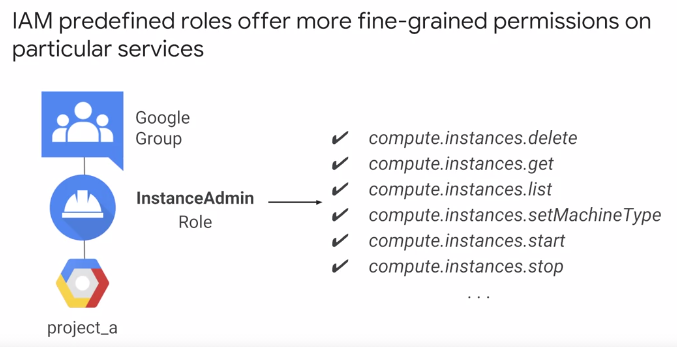 이 예에서 특정 Google 그룹의 모든 사용자들은 역할을 갖고 있다. 그리고 그들은 project_a의 모든 가상 머신에 대한 역할을 갖고 있다.