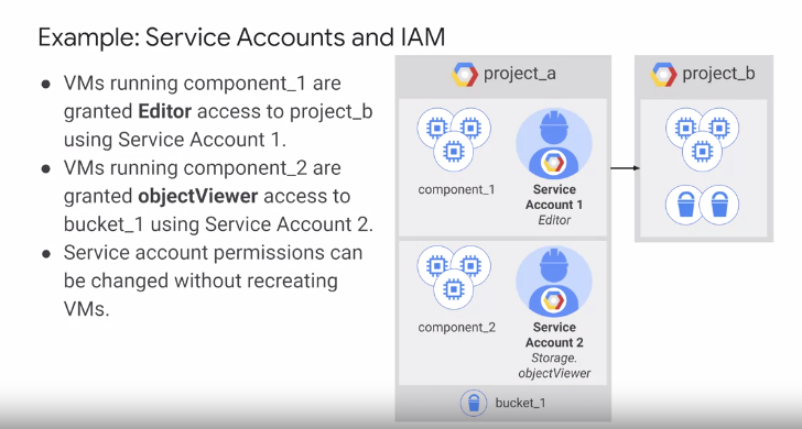 관리자는 프로젝트 안의 다양한 가상 머신(VM)의 그룹들에 대하여 다른 ID를 부여할 수 있다. 이는 각 그룹에 대해 서로 다른 권한을 손쉽게 관리할 수 있도록 해준다. 권한은 변경될 수 있다. VM을 다시 만들 필요는 없다.
