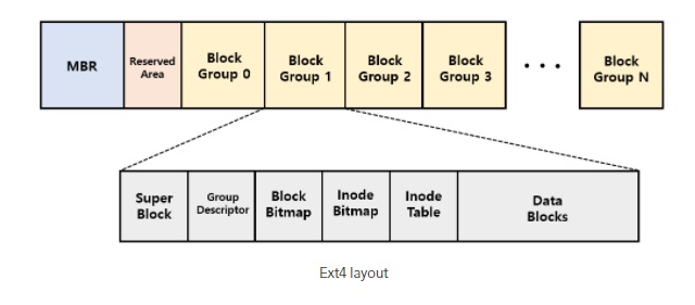부팅과 파티션 관리를 위한 MBR 영역 이후에 여러 개의 Block Group으로 나누어진 형태이다. 각각의 Block Group 속에는 여러 6개의 영역으로 나뉜다.