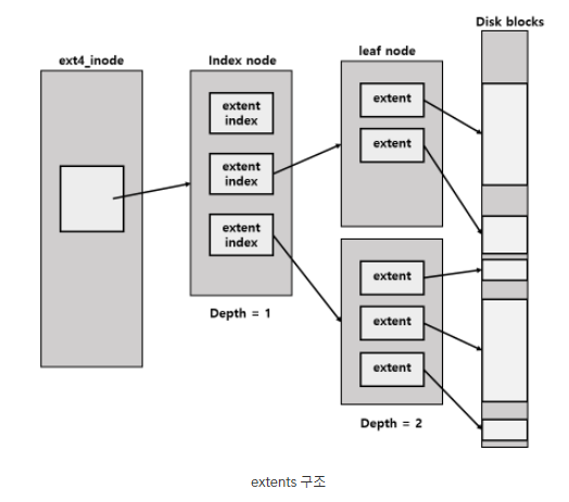 - ext4 : ext3와 거의 유사하지만, Block Mapping 방식이 아닌, extents Tree를 이용하여 파일을 관리한다.