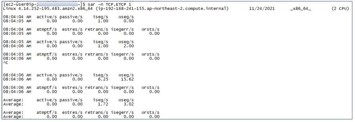active와 passive 수를 보는 것은 서버의 부하를 대략적으로 측정하는 데에 편리하다. retransmits은 네트워크나 서버의 이슈가 있음을 이야기한다. 신뢰성이 떨어지는 네트워크 환경이나(공용 인터넷), 서버가 처리할 수 있는 용량 이상의 커넥션이 붙어서 패킷이 드랍되는 것을 의심할 수 있다.