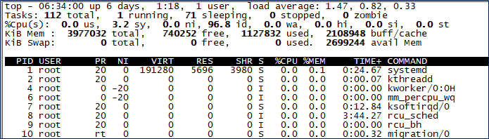- wa(wait I/O) : disk 혹은 기타 I/O 작업으로 인해 대기하는 CPU