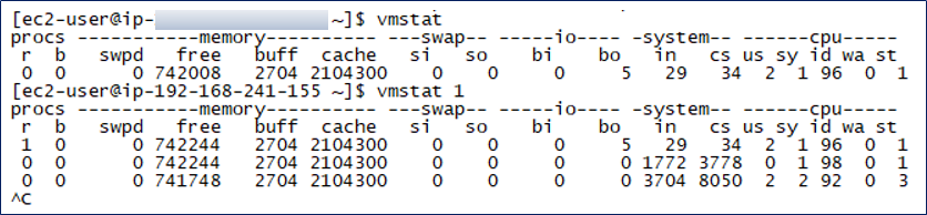- si = swap in, so = swap out : 수치가 0보다 높게 발생하면 메모리가 부족한 것으로 볼 수 있다. 단 free 메모리 수치가 높으면 스왑 메모리만 사용하는 것으로 실제 메모리는 여유 있는 것으로 볼 수 있기 때문에 종합적으로 보고 판단해야 함.