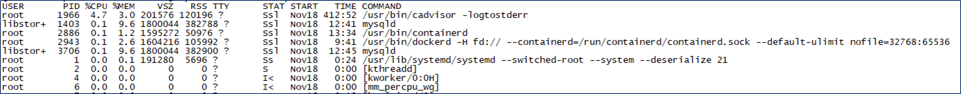 - ps -aux --sort=-%cpu // CPU 점유율 높은 순서로 내림차순으로 정렬시켜 점유율 높은 프로세스 확인