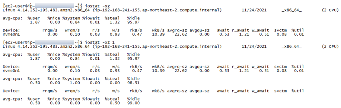 - iostat -xz 1 옵션을 주면 1초 마다의 상세한 모니터링을 할 수 있다.