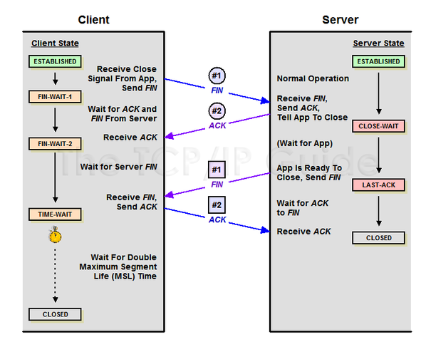 B Server에서 FIN을 전송하기 전에 전송한 패킷이 Routing 지연이나 패킷 유실로 인한 재전송 등으로 FIN 패킷보다 늦게 도착하는 상황 등이 발생할 수 있다. A Client 는 이러한 현상에 대비하여 B Server로부터 FIN을 수신하더라도 일정 시간(Default 240초) 동안 세션을 남겨놓고 잉여 패킷을 기다리는 데 이 과정을 "TIME-WAIT" 상태라고 한다. 일정 시간이 지나면, 세션을 만료하고 연결을 종료시키며 "CLOSE"상태가 된다.