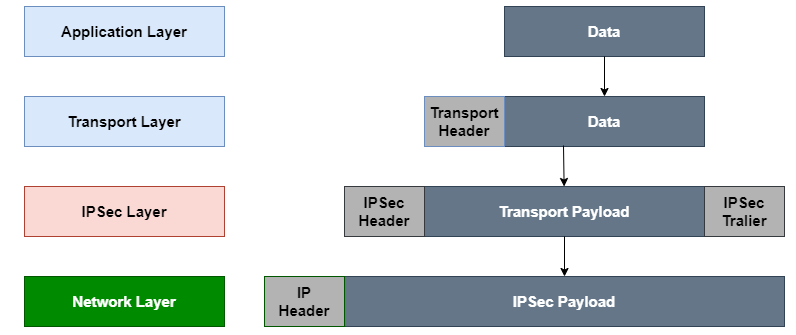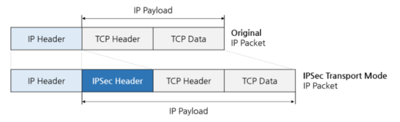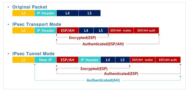 IPSec VPN 에는 아래와 같이 전송 모드 (Transport Mode) 와 터널 모드 (Tunnel Mode) 가 있으며 패킷 구조가 다르다.