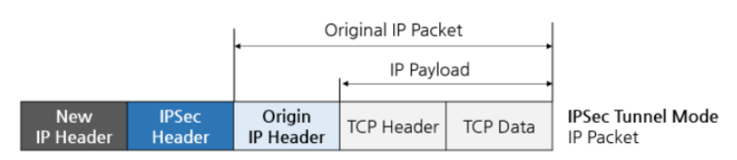 전송 모드와는 달리 터널모드는 IP 패킷 전체를 보호한다. 터널 모드에서는 IPSec 헤더가 IP 패킷 전체인 IP헤더+IP데이터(페이로드) 앞에 위치해있다. 게다가 새로운 IP 헤더가 IPSec 헤더 앞에 추가되어 있다.