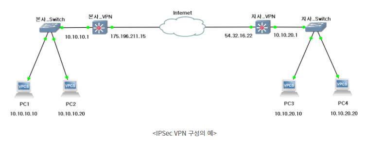 IPSec VPN 은 주로 Site-to-Site 방식으로 사용되는 VPN 이다. 다른 말로 하면 Network to Network 으로 VPN Gateway(방화벽) 장비 2개를 서로 연결함으로써 Network와 Network를 연결하는 VPN이다. 기업을 예시로 들면 본사(Site) 네트워크와 지사(Site) 네트워크를 VPN으로 연결하는 방식으로 볼 수 있다.