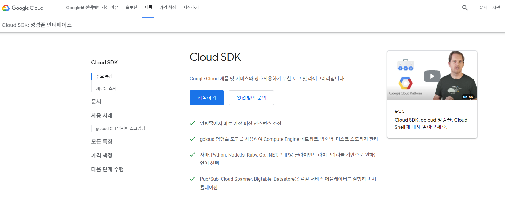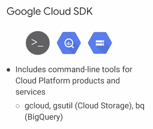 - Google Cloud SDK는 GCP안의 당신의 으용 프로그램과 리소스들을 관리하기 위해 사용할 수 있는 도구 모음이다.
