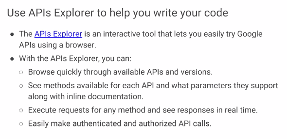 GCP 리소스를 제어하는 애플리케이션을 작성하는 경우 API를 올바르게 사용해야 한다. 이를 위해 API Explorer 을 사용한다. GCP Console은 APIs Explorer라는 Tool을 포함한다. 이것은 당신이 API들에 대하여 대화적으로 학습하는 데에 도움을 준다.