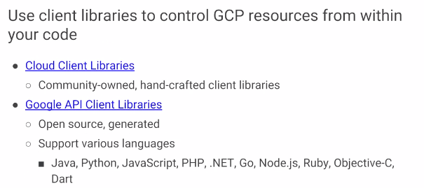 Google은 코드에서 GCP를 호출하는 작업에서 많은 번거로움을 덜어주는 Client Library들을 제공한다.