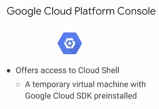 - Cloud Shell에서 Google SDK(Software Development Kit)가 제공하는 도구를 사용할 수 있다. 이는 미리 설치되어 있어서 새로 설치할 필요가 없다.