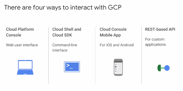 : RESTful APIs, GCP는 당신이 작성하는 코드가 애플리케이션들을 Control 하기 위하여 애플리케이션 프로그래밍 인터페이스를 제공한다.