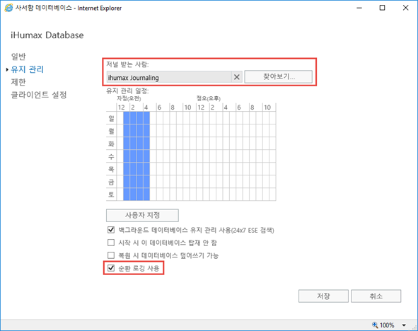 유지 관리 -> 저널 받는 사람 지정 -> 순환 로깅 체크 및 저널 사서함 선택